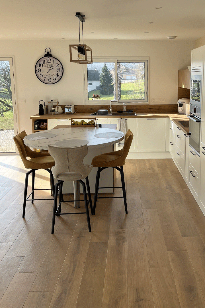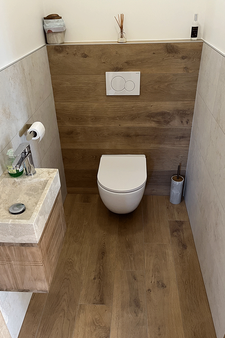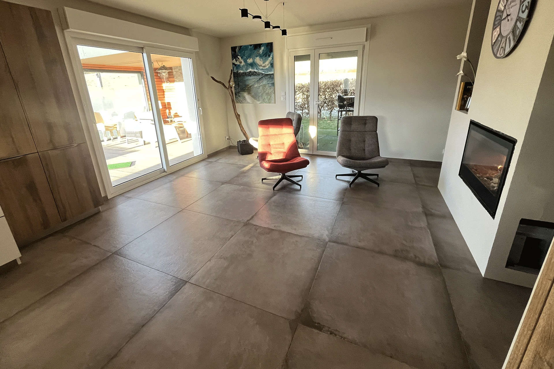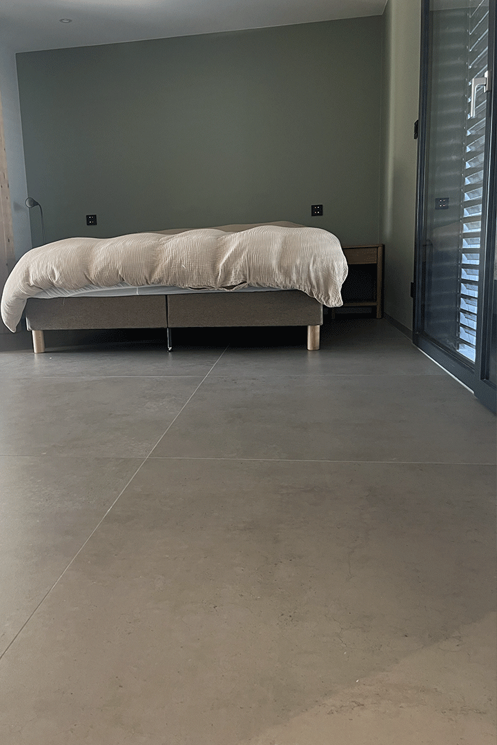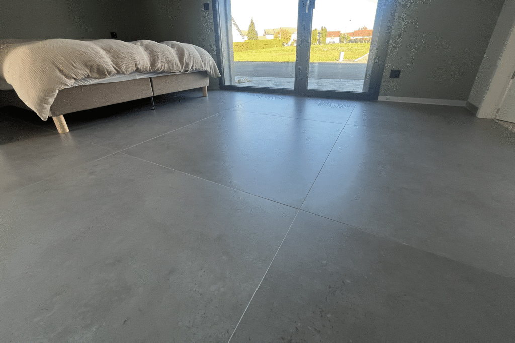 Pour la boulangerie, nous avons donc choisi des carreaux de grand format en aspect minéral dans des tonalités de beige & gris. Ces carreaux, avec leur élégance sobre, agrandissent visuellement l’espace et apportent une touche contemporaine qui se marie à la perfection avec notre second choix, un carrelage imitation bois.