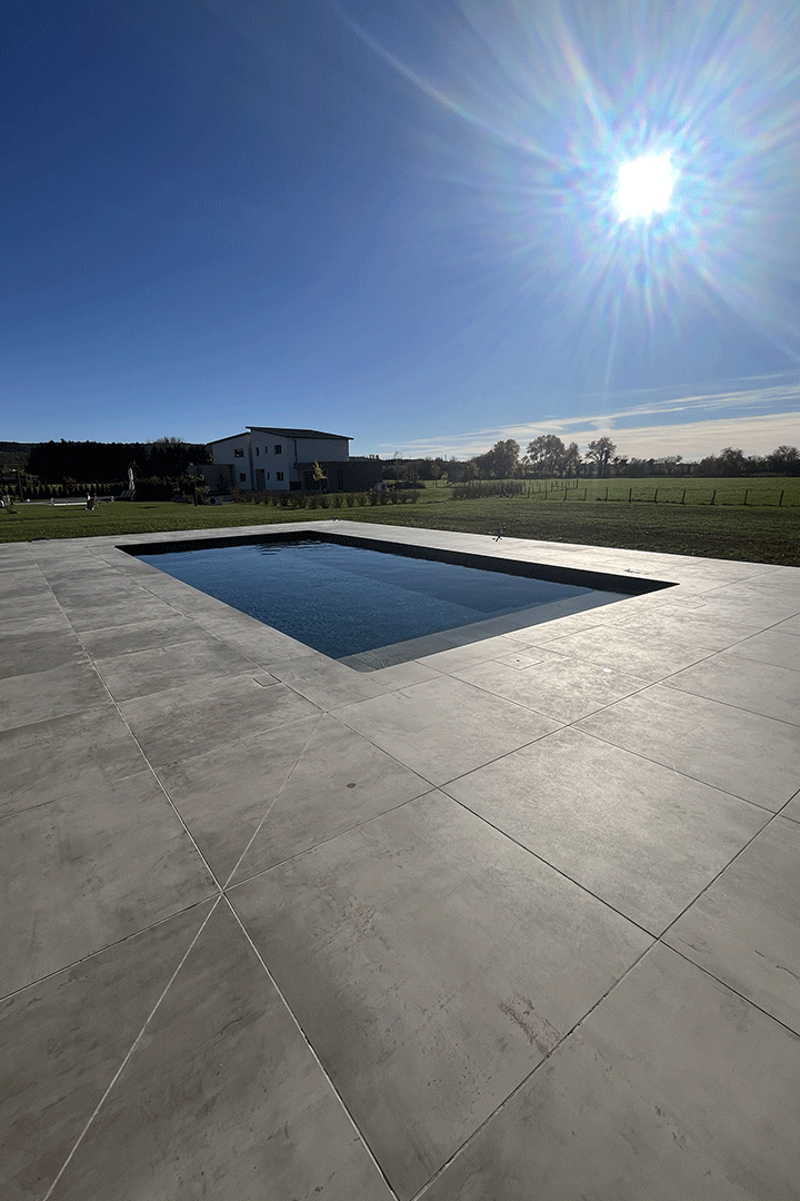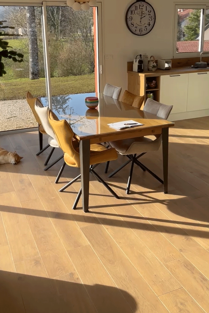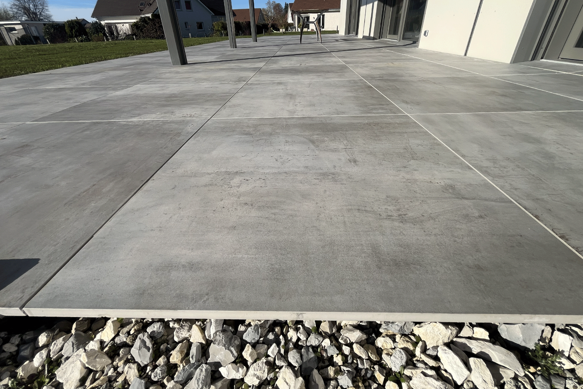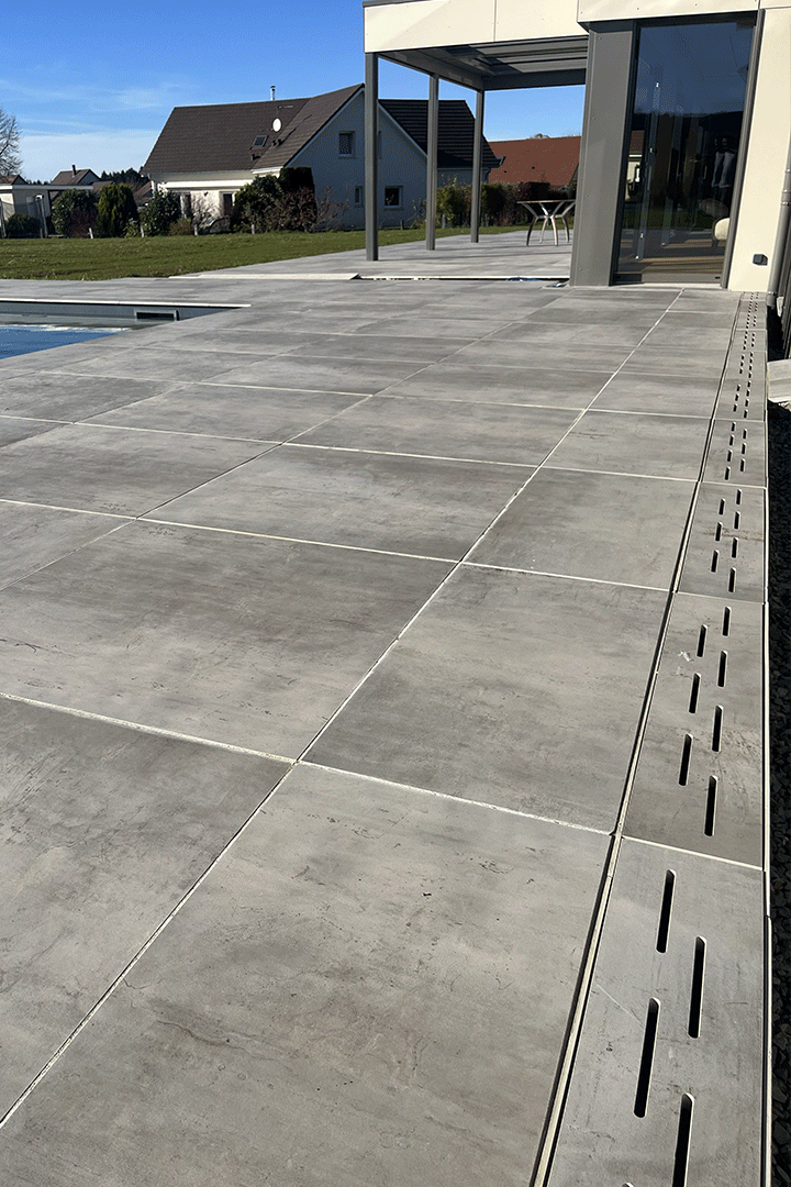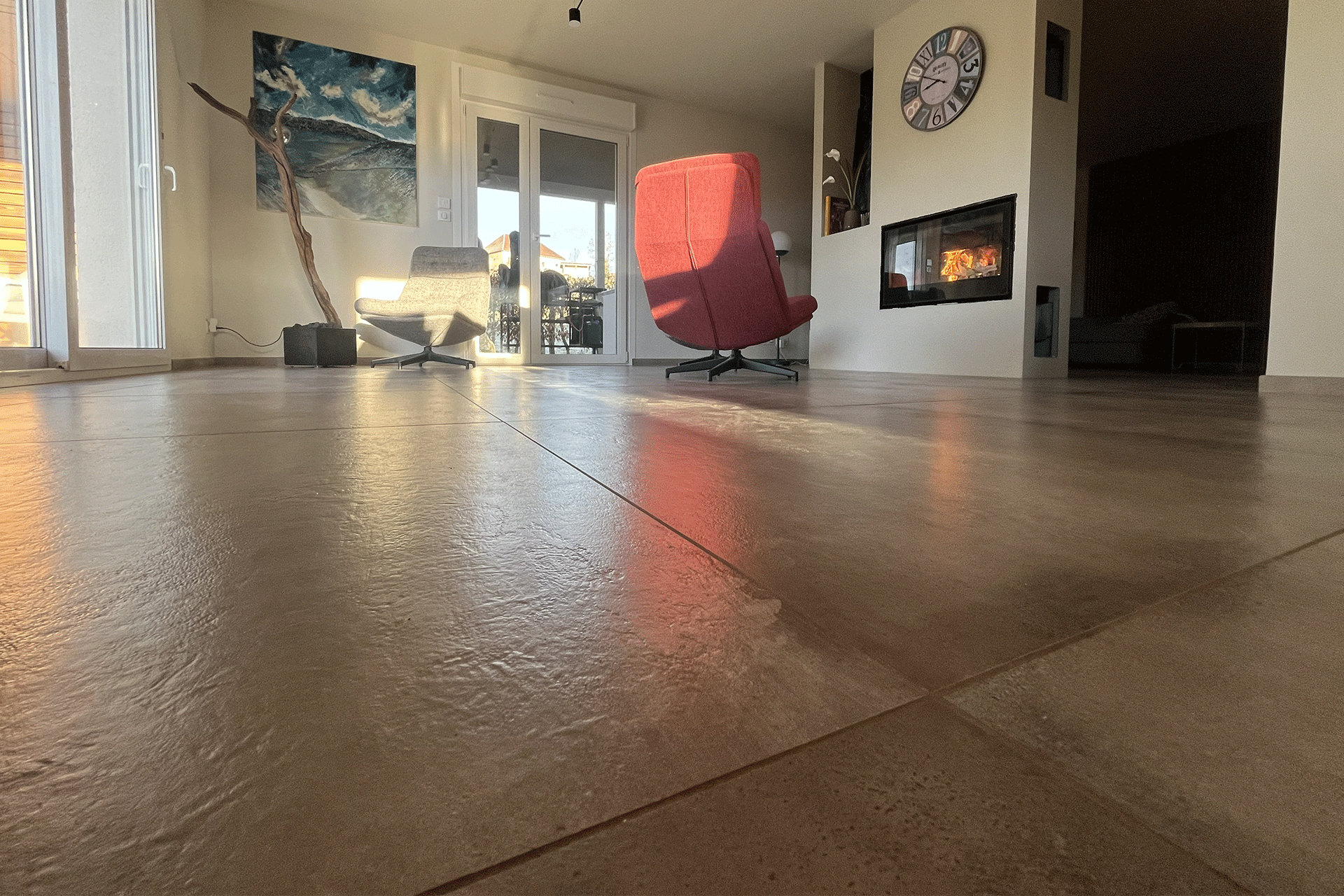 Pour la boulangerie, nous avons donc choisi des carreaux de grand format en aspect minéral dans des tonalités de beige & gris. Ces carreaux, avec leur élégance sobre, agrandissent visuellement l’espace et apportent une touche contemporaine qui se marie à la perfection avec notre second choix, un carrelage imitation bois.