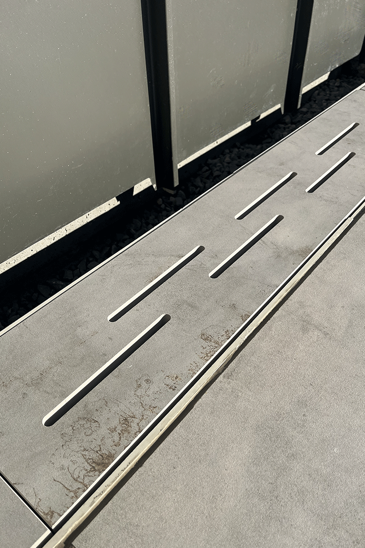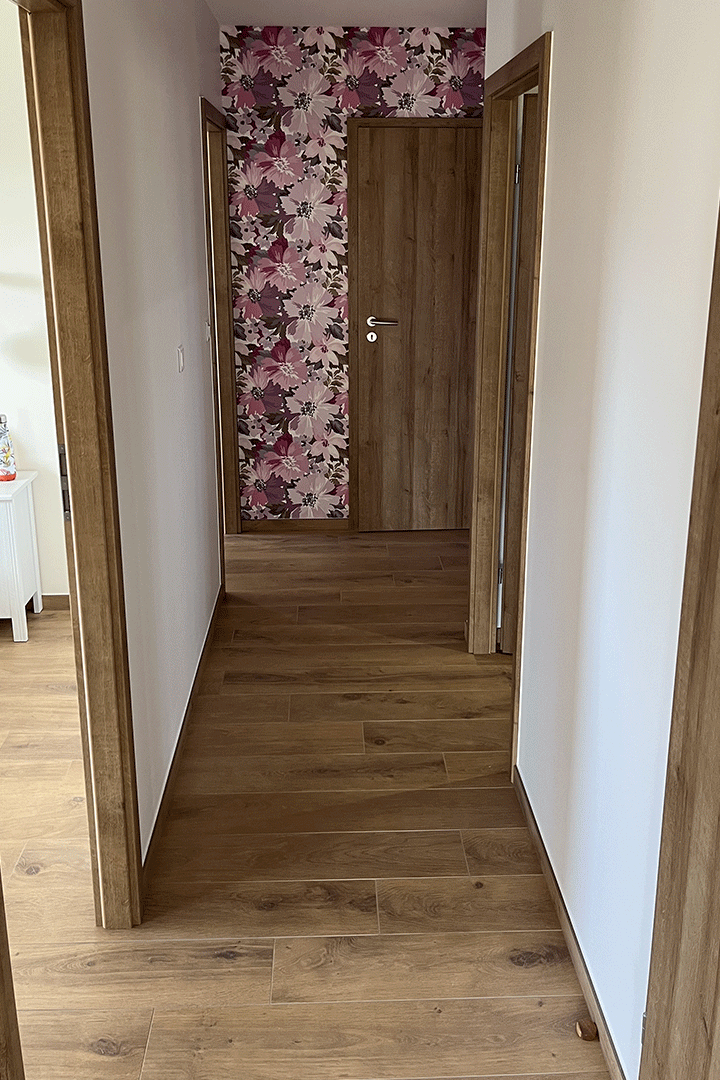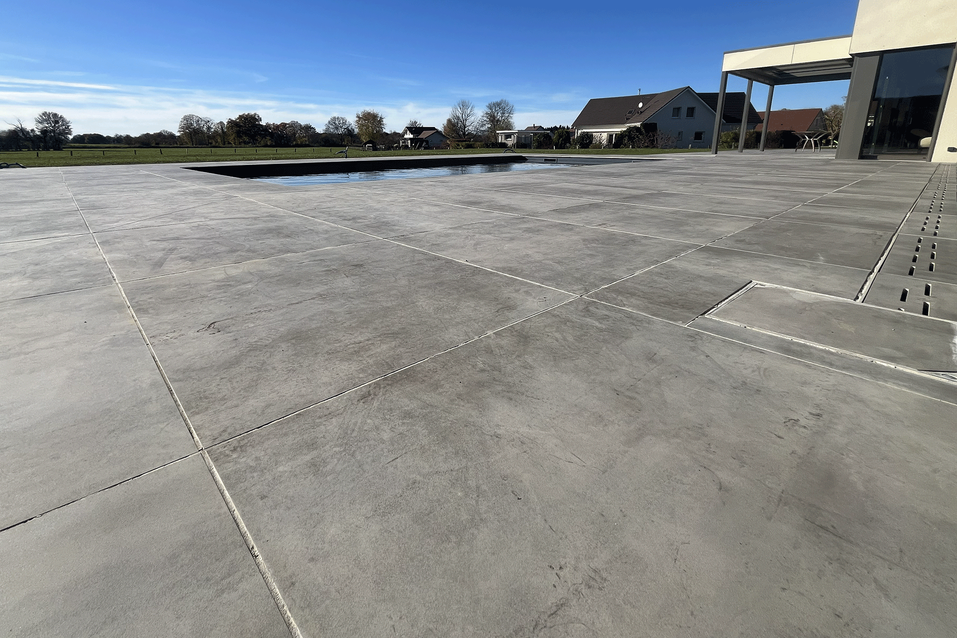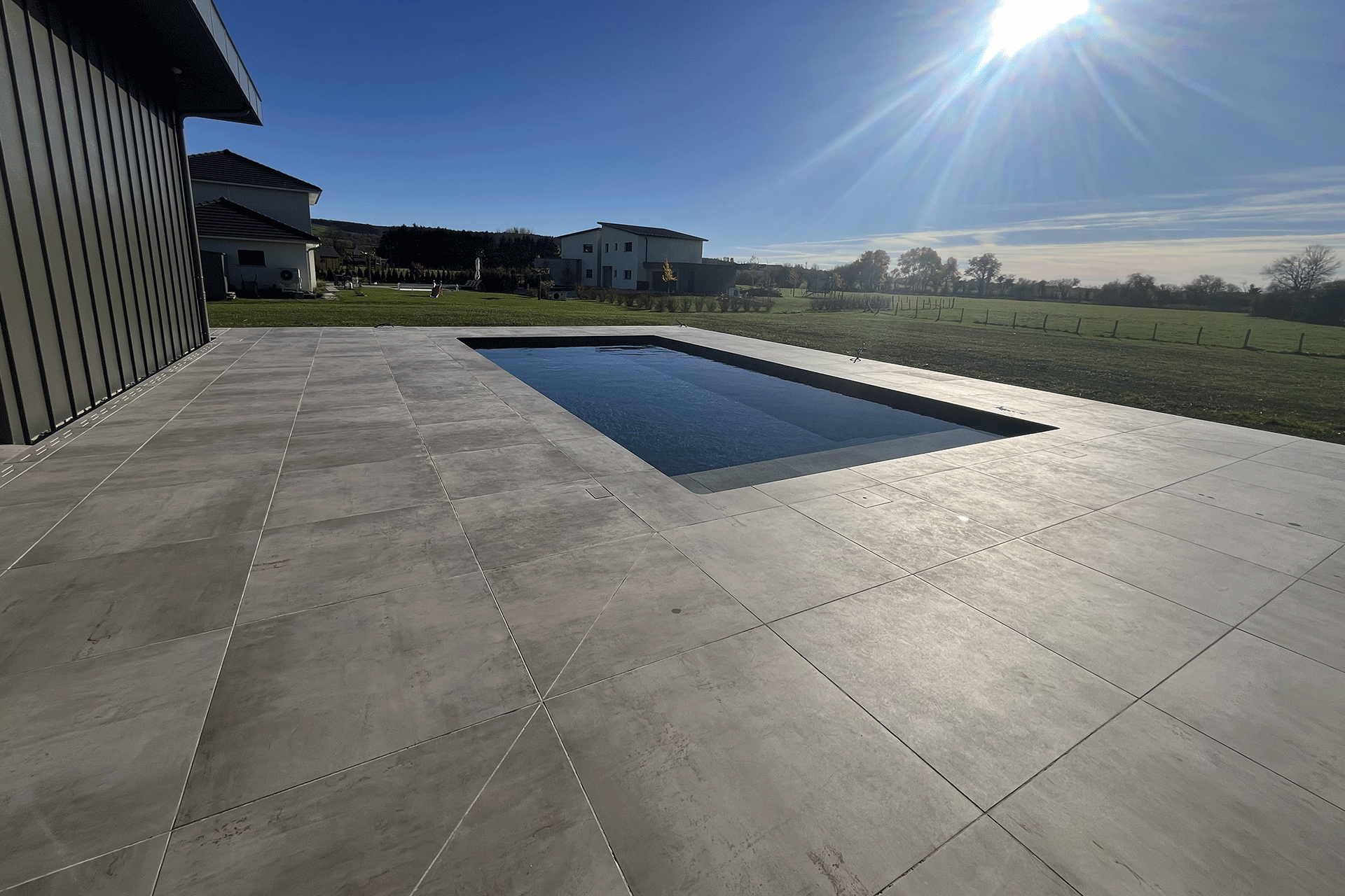 Pour la boulangerie, nous avons donc choisi des carreaux de grand format en aspect minéral dans des tonalités de beige & gris. Ces carreaux, avec leur élégance sobre, agrandissent visuellement l’espace et apportent une touche contemporaine qui se marie à la perfection avec notre second choix, un carrelage imitation bois.